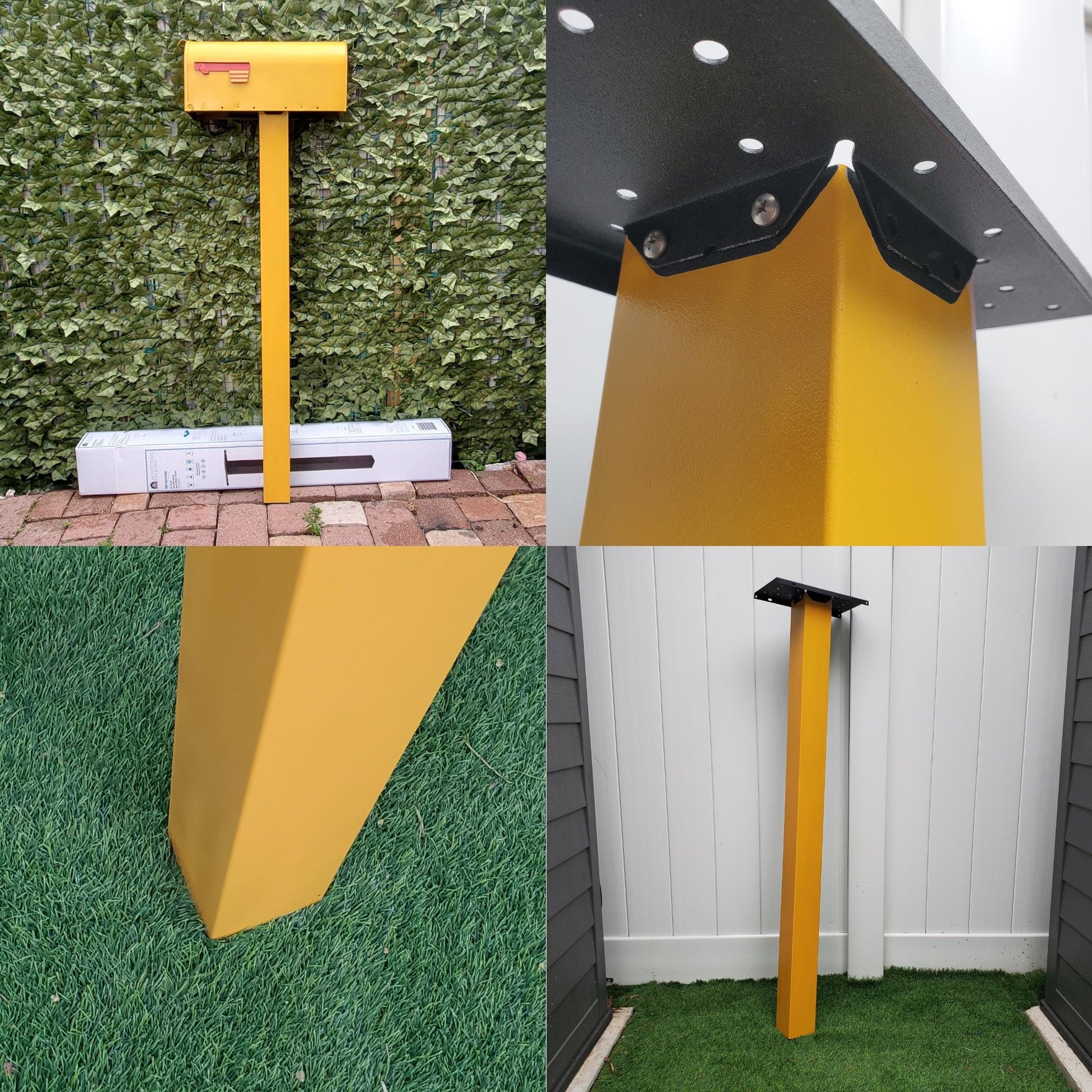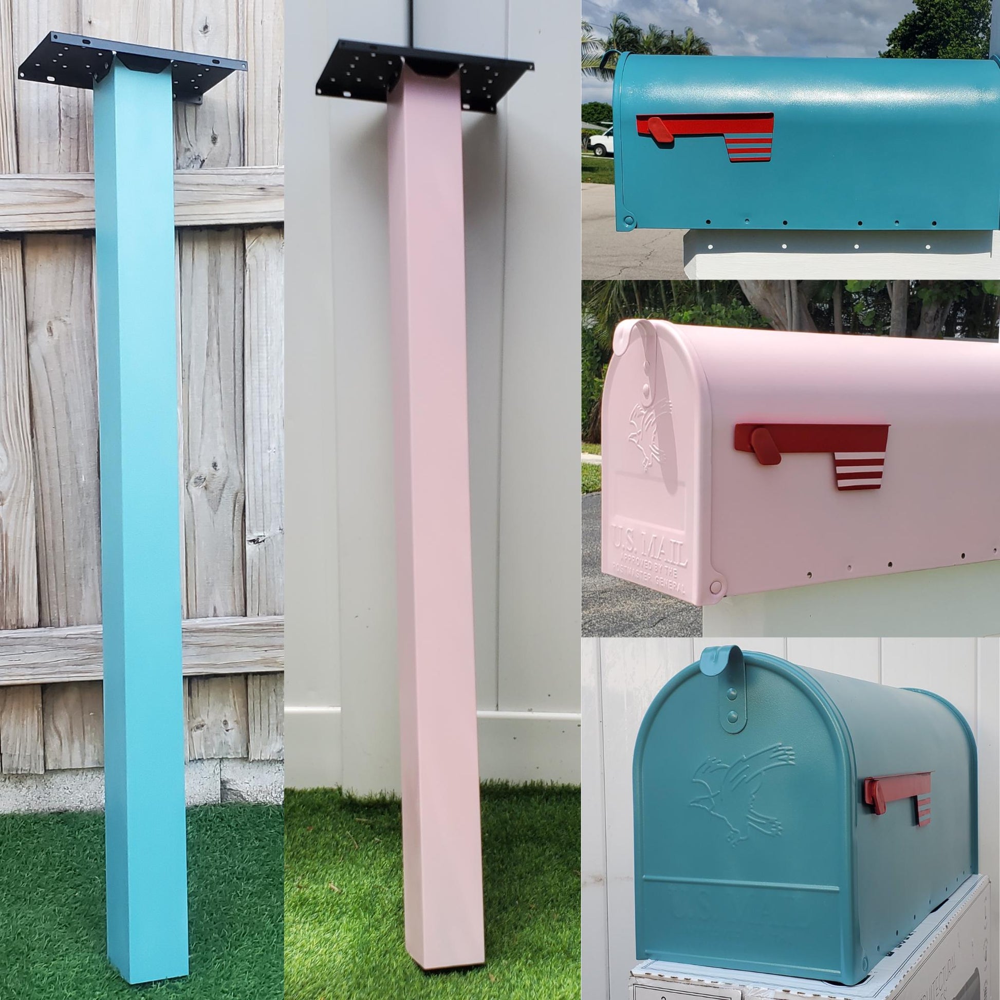 These are durable and low maintenance aluminum mailbox posts that I purchase and paint. Each post is painted with high quality spray paints and a high gloss UV protectant spray. This squared post installs directly into the ground and should be set in concrete. The steel mounting bracket accommodates most medium to large size mailboxes, and it will support up to 100 pounds of evenly distributed weight.