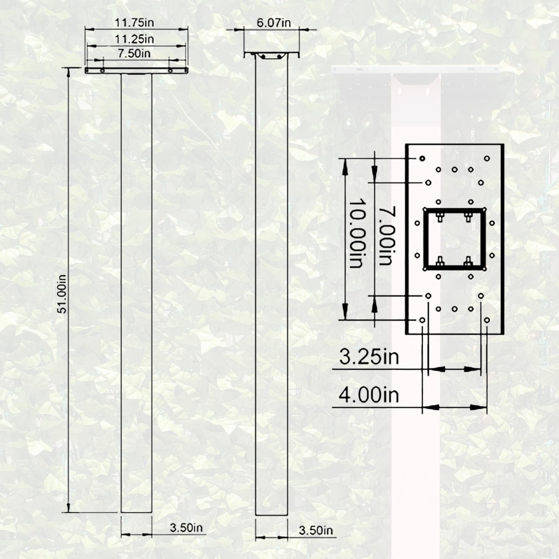 This is a standard in-ground mailbox post, compatible with most mailbox sizes and styles. Please message me if you're unsure. All necessary pieces should be included to attach your mailbox. You will find pre-drilled holes on sides and bottom of bracket for easy installation. This assembled post measures 51'H x 6'W x 11.8'D.