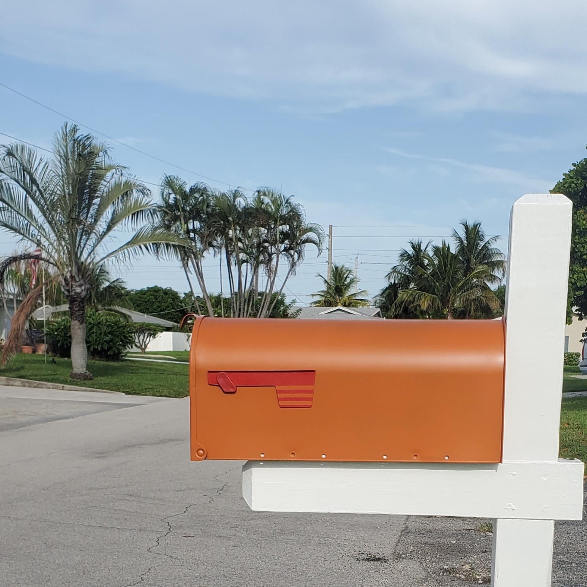 Add a pop of color and charm to your home's exterior with this Farmhouse Orange Mailbox. This custom mailbox is the perfect blend of rustic style and modern functionality, making it an excellent housewarming or closing gift for new homeowners.
