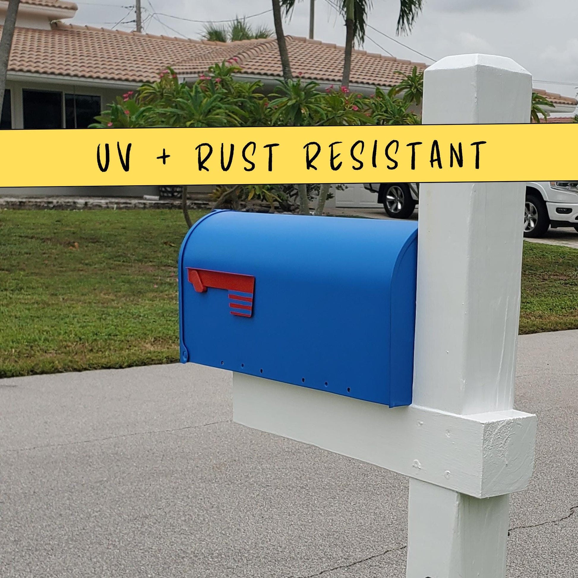 These are metal post mount mailboxes that I purchase and paint. All are painted with high quality spray paints and a high gloss UV protectant spray, maintaining its vibrant hue and stylish appearance over time. The durable, protective coating provides for a long lasting finish and excellent resistance to fading, chipping and abrasion.