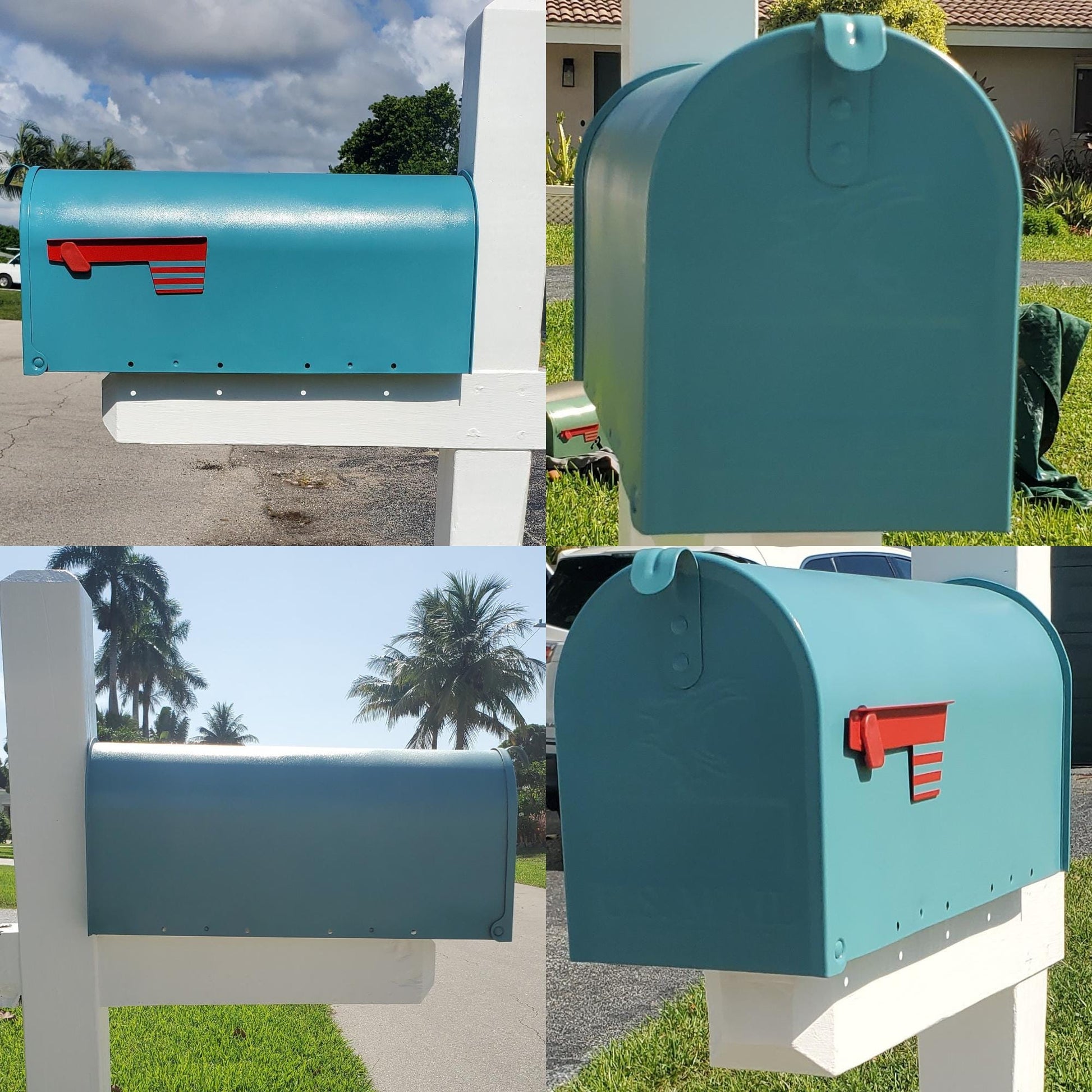 These are metal post mount mailboxes that I purchase and paint. All are painted with high quality spray paints and a high gloss UV protectant spray, maintaining its vibrant hue and stylish appearance over time. The durable, protective coating provides for a long lasting finish and excellent resistance to fading, chipping and abrasion.